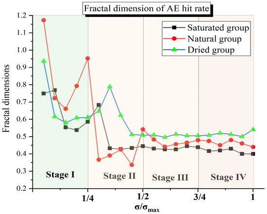 The change in the AE correlation dimension of rock reflects the internal damage evolution of rock, and the decrease in the fractal dimension indicates the occurrence of a main fracture or failure [78]. Some research has shown that the fractal dimension increases with the increasing levels of applied stress, and when the stress reaches about 40% of the peak stress, the fractal dimension begins to decrease [79]. According to the stress ratio, the fractal dimensions of the AE hit rate of sandstones with different water contents are calculated using the G-P algorithm, as shown in Figure 11. As the stress ratio increases, the AE hit rate fractal dimension experiences a process of decreasing, increasing, and then decreasing again until achieving final stability. When the stress is 0–15% of the peak stress, the average fractal dimension of the three groups’ sandstone begins to gradually reduce. The largest fractal dimension is 1.17 for the natural group, and the smallest fractal dimension is 0.55 for the saturated group. When the stress is 15–50% of the peak stress, the average fractal dimension of the three groups’ sandstone increases first and then decreases with obvious fluctuations. The fractal variation range is large, between 0.33 and 0.95, indicating that internal cracks in the rock are generated and disorderly expanded at any time after the sandstone is loaded. When the stress exceeds 50% of the peak stress, the AE signal increases significantly, and the average fractal dimension of the three groups’ sandstone is no longer significantly reduced, indicating that the damage to the rock is accumulating gradually at the failure site of the specimen to form macroscopic cracks. When the load reaches peak stress, the internal micro-cracks of the specimen gradually evolve into macroscopic cracks, accompanied by a sharp release of energy. Through the calculation of the AE hit rate fractal dimension, the similarity of AE activity inside a rock specimen during its deformation and failure processes is revealed, and the internal AE hit rate undergoes a change, from order to chaos and then back to order. When the micro-cracks in sandstone gradually transform into macroscopic cracks, the fractal dimension is no longer significantly reduced. Comparing the fractal dimensions of three groups’ sandstone, it is found that sandstone has the largest stable dimension of 0.52 in the dry group, and the smallest stable dimension of 0.41 in the saturated group. The stable dimension of sandstone in the natural group is in between, which is 0.46. The calculation results show that the fractal dimension of the AE hit rate of sandstone under different water content conditions has certain differences, which also reflect the influence of water content on the fracture deformation of sandstone. When the sandstone is dry or the water content is low, the fractal dimension of the hit rate is large, which means that the micro-cracks generated in rocks are more complex, and the rupture degree is deeper, with a larger amount of energy released. When the sandstone is saturated, the fractal dimension of the hit rate is small, which means that the micro-crack agglomeration is not obvious, and the rock is not fully broken.