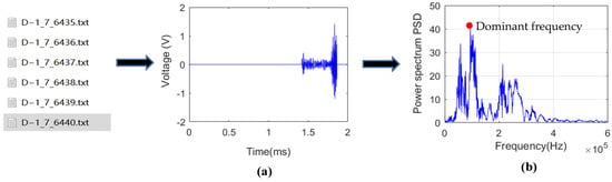 The acoustic emission signal contains a lot of information on the evolution of internal damage sources in the process of rock deformation and failure. The AE signal is often composed of multiple frequency components, which can reflect the size, type, and scale of the collected cracks. Therefore, the spectrum information obtained by processing the AE signal can reflect the fracture’s evolution process in rocks [80,81]. Fast Fourier transform (FFT) is adopted to convert a signal from the time domain to the frequency domain and extract its spectrum to obtain the frequency structure of the signal.