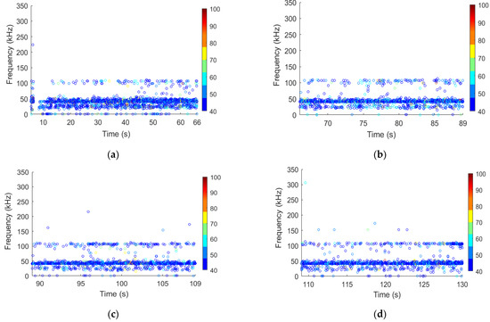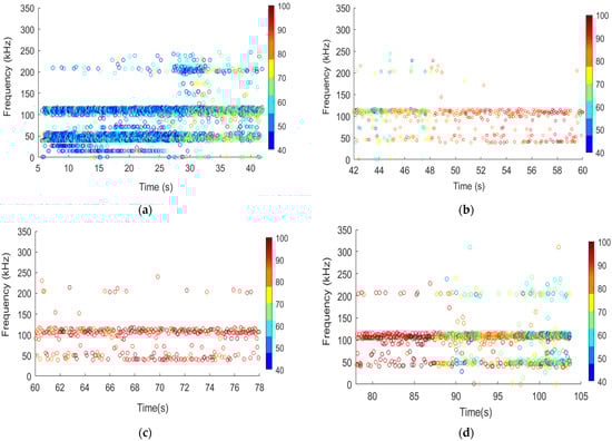 Distribution of dominant frequency domain for dried specimen D−1: (a) Stage I; (b) Stage II; (c) Stage III; (d) Stage IV.