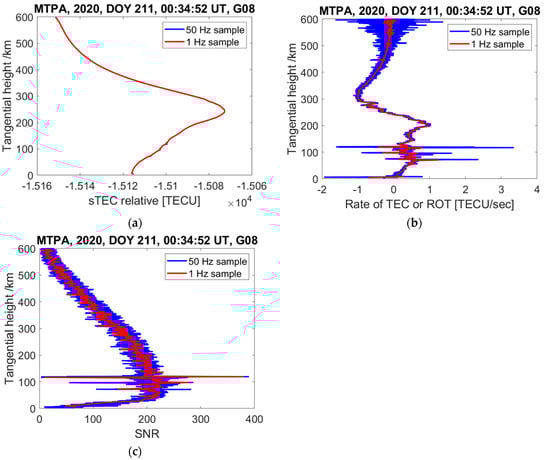 Examples of relative (i.e., uncalibrated) sTEC, ROT, and SNR profiles obtained from the same RO event are shown in panels (a–c), respectively. The blue and red colored plots in panel a, b and c show computation from 50 Hz and 1 Hz sample data, respectively. In panel a, the blue colored plot is hidden under the red colored plot.