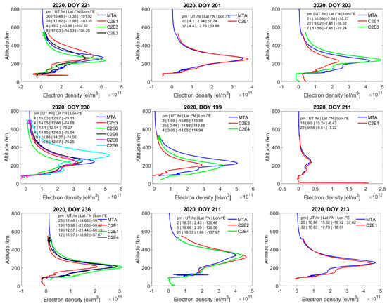 Figure 2 shows similar altitude variations for the collocated MetOp-A and COSMIC-2 Ne profiles. Six COSMIC-2 satellites are orbiting the Earth at an altitude of about 550 km in a low-inclination orbit. Therefore, we found multiple collocated COSMIC-2 Ne profiles for a single MetOp-A Ne profile. Although the collocation criteria are the same (tangential points of peak parameters within 300 km and 2 h) for those profiles, the geometry of the occultation plane (e.g., azimuth) is not the same in each case. Due to this, we see that the collocated COSMIC-2 Ne profiles are not the same but rather differ from one another.
