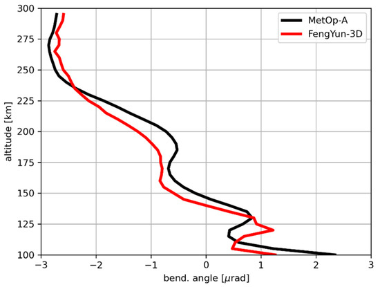 Mean bending angle profiles for GPS L1 signal derived from co-located MetOp-A and Fengyun-3D datasets (DOYs 176 to 254 of 2020).