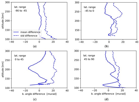 Mean and standard deviation of the differences between the bending angle profiles at GPS L1 from MetOp-A and Fengyun-3D when considering the entire dataset (DOYs 176 to 253). Panel (a) shows the statistics for the 90°S–45°S latitude region covering all longitudes. Similarly, panels (b–d) show statistics for 45°S–0, 0–45°N, and 45–90°N latitude regions, respectively.