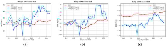 Daily values of the MetOp-A (panel (a)), MetOp-B (panel (b)), and MetOp-C (panel (c)) DCBs during DOY 224 to 252, 2020, computed by EUMETSAT (red curves) and UPC (blue and cyan curves correspond to 2- and 4-layer approach).