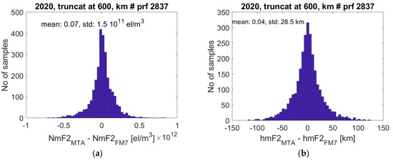 The quality of RO electron density profiles derived by using the Adaptive topside ionosphere/plasmasphere model technique briefly described in Section 3.3 (also in [6]) is assessed by investigating the systematic differences between similar products from other LEO satellite missions. For this purpose, we identified pairs of co-located electron density profiles from different LEO satellite missions. As a definition of co-located profile-pair, the occurrence of peak parameters within 300 km distance and 2 h of each other is used [8]. For example, Figure 8 shows the distribution of F2-layer peak electron density NmF2 and corresponding height hmF2 differences between MetOp-A and COSMIC-2 co-located profiles for the 600 km extension campaign. The mean and STD of differences are given in the plots as well.