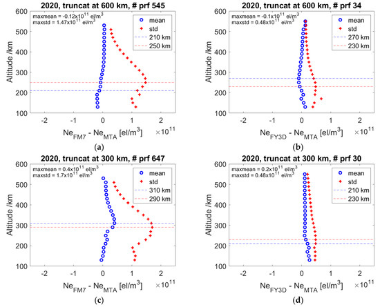 The top panel of Figure 9 shows that the largest mean deviation and STD values are found as −0.12 × 1011 el/m3 and 1.47 × 1011 el/m3 at about 210 and 250 km height, respectively, when MetOp-A Ne profiles are compared with COSMIC-2 Ne profiles. Negative mean deviation at almost all altitudes indicates that MetOp-A Ne values are slightly larger than the COSMIC-2 Ne values. The maximum mean deviation is found to be similar, whereas the STD value (about 0.48 × 1011 el/m3) is smaller (with respect to the COSMIC-2 case) when comparing co-located MetOp-A Ne profiles with the corresponding Fengyun-3D profiles. The reason for smaller STD values may be that the MetOp-A and Fengyun-3D Ne profiles are distributed over all latitudes instead of concentrated only at low latitude regions, which is the case for the COSMIC-2 data. Panel c of Figure 9 shows that for the 300 km campaign, the mean deviation is much higher compared to the 600 km campaign. Positive mean deviation almost at all altitudes indicates that MetOp-A Ne values are smaller than those of COSMIC-2 Ne profiles. Comparing panels c and d plots, we see that the residual statistics for Fendyun-3D data are smaller than those of COSMIC-2 data, as was the case for the 600 km campaign.