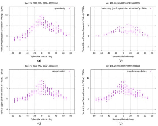 Vertical Upper Electron Content (VUEC in TECU above 790 km up to GNSS height) estimated using TOMION with 4-layers (two upper above 790 km) around 23:00 h on 24 June 2020 is plotted as a function of latitude. Panel (a) shows VUEC estimated from +150 ground GNSS receivers only, panel (b) shows VUEC from MetOp POD data only, panel (c) shows VUEC from MetOp POD and ground GNSS data, and panel (d) shows VUEC from MetOp POD, ground GNSS and DORIS data from SARAL, Sentinel-3A, and Sentinel-3B LEOs.
