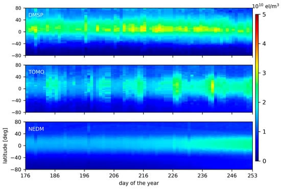 Table 5 provides a statistical view of the tomography performance considering all analyzed days averaged over distinct latitudinal regions. As can be seen, the model performance is worse closer to the equatorial region and improves at mid- and high-latitudes. This is an expected pattern due to the higher level of ionization in the equatorial region. As we can see, there is a clear negative bias by the NEDM background model of around 0.45 × 1010 el/m3. This negative bias has been reduced in tomography by half, up to an average of 0.19 × 1010 el/m3. The standard deviation has slightly reduced from 0.45 to 0.44 × 1010 el/m3. The lower standard deviation of the background in a few cases mainly occurs due to the low level of Ne variabilities at the locations with high electron density values, as NEDM represents climatological patterns of the ionosphere.