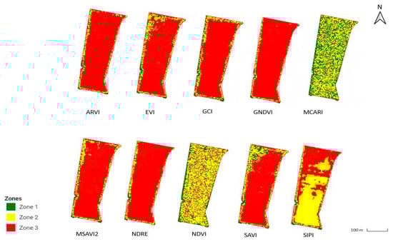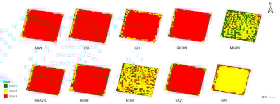 The maps generated using the k-means algorithm for the Zamora field (Figure 8) revealed an interesting peculiarity. Despite identifying the base pattern observed in the yield zone map (Figure 4), where the differentiation between the headland and border zones and the rest of the plot is apparent, several indices, such as ARVI, EVI, MSAVI2, NDRE, and SIPI, exhibited a two-zone classification when applied to the k-means model. This was likely due to the similarity in their values, which prevented the k-means model from establishing a three-zone classification.