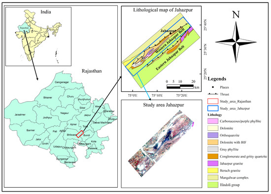 - Malhotra, G.; Pandit, M.K. Geology and Mineralization of the Jahazpur Belt, Southeastern Rajasthan. In Crustal Evolution and Metallogeny in the Northwestern Indian Shield: A Festschrift for Asoke Mookherjee; Alpha Science International: Oxford, UK, 2000; pp. 115–125. [Google Scholar]