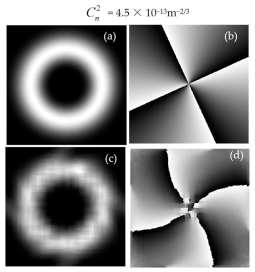 The vortex waves propagating in the atmospheric turbulence, where is 4.5 × 10−13 m−2/3. (a,b) The intensity and the phase of the electromagnetic wave before propagation. (c,d) The intensity and the phase of the electromagnetic wave in the turbulence.