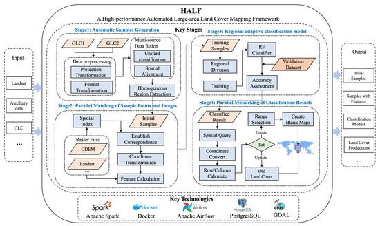 The HALF provides solutions for each stage of land cover mapping, as shown in Figure 2. It takes remote sensing image data, auxiliary data, and prior GLC products as input. Initially, a large number of initial samples are automatically generated. Then, training features are obtained by overlaying the samples with remote sensing and auxiliary data. Then, the generated samples are used to adaptively train the classifier. Finally, the final land cover product is generated by mosaicking the classification results of remote sensing images. The HALF accelerates the execution speed of the model in the mapping process through Spark, which encapsulates the models for each stage using Docker, which organizes the process using the Airflow workflow engine to read and process remote sensing image data using GDAL, which stores metadata information and performs spatial operator operations using Postgres SQL. The HALF’s mapping process mainly includes the following key stages shown in the figure below and described in the following subsections.