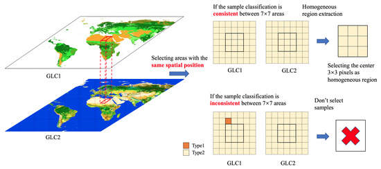 The essence of sample selection is to obtain the spatial position of a certain pixel and its corresponding land cover type, which can be directly derived from existing products. Selecting high-precision training samples from land cover products is the key and prerequisite to obtain high-precision classification results. In order to ensure the reliability of samples, this section proposes a method for extracting homogenous areas from multi-source product data. The idea of homogenous area extraction is shown in Figure 3. First, select two land cover products with identical spatial range, resolution, and data acquisition time. Next, search for a (7 × 7) pixel range with an identical classification label in the same spatial position within a single product and between the two products. Finally, consider the middle (3 × 3) area as a homogenous region and quantify the number and distribution of these areas. The central pixel is selected as a high-confidence sample for extraction, thereby eliminating spatial deviations between the two land cover products and improving the reliability of samples.