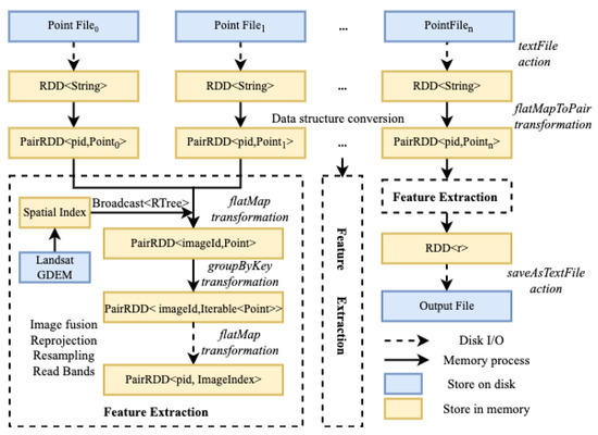 Remote sensing image mosaicking is the process of stitching multiple remote sensing images into a single geometric alignment composite scene for a wide field of view. Large-area image mosaicking is a computationally intensive process [20]. Creating a national or global level product by mosaicking tens of thousands of image scenes that cover tens of terabytes of data could take several days or even weeks to complete [21]. Using high-performance computing methods to process each task in parallel can improve the efficiency of image mosaicking. Researchers have studied parallel mosaicking methods. Zhang et al. [22] combined aerial digital photogrammetry principles with parallel computing techniques to propose a parallel mosaicking method for massive aerial digital images. Chen et al. [23] improved an algorithm used for video image mosaicking to make it suitable for remote sensing images, thereby overcoming the problem of multi-images having to be divided into one-to-one mosaics. Ma et al. [24] improved parallel mosaicking efficiency by creating a dynamic task tree to divide the processing order of remote sensing images. Remote sensing data, intermediate data, and result data undergo frequent I/O operations during the computation process, which can lead to I/O bottlenecks. Jing et al. [25] customized Resilient Distributed Dataset (RDD) operators in Spark to accelerate the parallel mosaicking process through in-memory computation. Ma et al. [21] introduced a memory-based file management system called Alluxio, which was combined with computing-intensive remote sensing image mosaicking to effectively alleviate the I/O bottleneck in the mosaicking process. The process of mosaicking classification results is similar to that of remote sensing image mosaicking, but mapping after all data within the study area are collected may decrease the efficiency of dataset updating. Therefore, when mosaicking the classification results, it is necessary to consider that the acquisition time may vary between different regions.