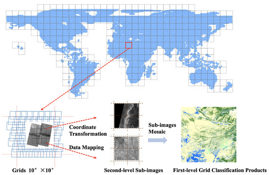 Schematic diagram of the mosaicking method for classification results. The world is partitioned into a grid system with each grid spanning 10° × 10°, and each grid is further divided into second-level sub-images. The blue border indicates the extent of the Landsat image, and when there are classification results within the grid, the pixels of the second-level sub-images within the spatial extent of the classification result are updated, and the final mosaic product is generated.