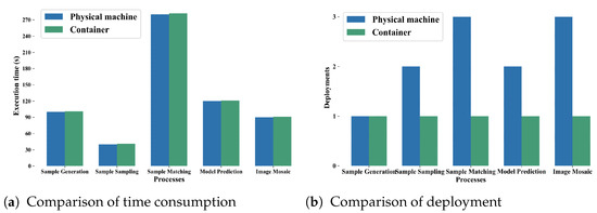 We compared the deployment workload and execution time of the operators’ running tasks in containers and hosts. Deploying conventional applications on a physical machine may depend on multiple development and runtime environments, and the complexity of configuration depends on environment dependencies. For example, sample generation only requires a Python basic environment and GDAL to read images; the sample–image matching model is written in Java and also depends on Spark and GDAL; image training requires GDAL in the Python environment to fuse and resample images. The deployment of GDAL in the Python environment operating on the physical machine can be installed through conda, but the GDAL tool in the Java environment involves gcc compilation, which is extremely cumbersome. By pulling images provided on Docker Hub, the existing environment can be directly pulled and run, and the deployment workload is only one. Therefore, compared with the physical machine environment, the deployment efficiency can be effectively improved in the Docker container environment. Figure 8 shows the total time spent in production. The reason why the running time was longer in the Docker environment than in the physical machine environment is that the startup and destruction of Docker containers took some time, but the impact was very small in seconds. In addition, Docker containers themselves have the characteristic of light weight and will not occupy additional memory resources. In summary, deploying the model through Docker did not bring any losses in execution performance, but, compared to deploying the environment on a physical machine, it could reduce the configuration workload, thus making it convenient to migrate and reuse programs when deploying the production environment on new machines.