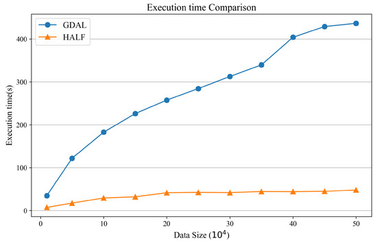 Performance comparison of matching method. The orange line indicates the time consumption of the matching method of HALF, and the blue line indicates the time consumption of the matching method of GDAL.