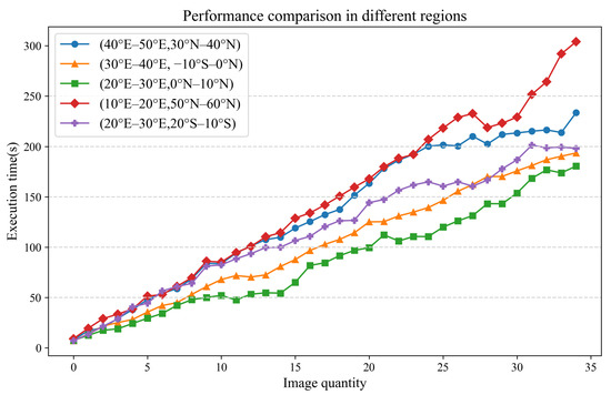 The study selected five regions with different latitudes that were all located on land. Figure 13 shows the changes in method runtime as the number of remote sensing images increased. To facilitate comparison, all these regions were located entirely on land. It was found that, regardless of the region, the method’s processing time showed a linear trend as the number of images increased. This is because, during the calculation, a correspondence was established between the sub-images and the remote sensing images, and the calculation tasks were distributed based on the sub-images. For each calculation task, the remote sensing images were traversed and calculated. Therefore, as the number of images increased, the method’s processing time increased almost linearly. In addition, the higher the latitude of the region, the more time it took to process the same number of images, because Landsat images at higher latitudes undergo distortion due to different projections, thereby resulting in larger image sizes and longer read times.