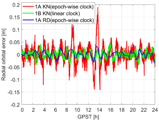 If the projected mis-modeled effects are of different sizes, the orbital improvements could exhibit slight differences even when applying the same clock models. As examples, real data from GRACE FO-1 and another satellite GRACE FO-2 on 3 December 2019, i.e., more than one year after the test day above, are processed, also using the CNES real-time GPS orbits and clocks. The slight differences in the radial orbital errors without applying any clock models, as shown in Figure 13, could be caused by the different mis-modeled effects and their different projections on the orbits. These could be attributed to comprehensive effects caused by the different real-time GPS orbital and clock errors, different satellite geometry, and the different mis-modeled effects induced by the model deficiencies in the reference reduced-dynamic orbits.