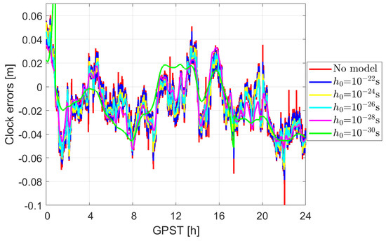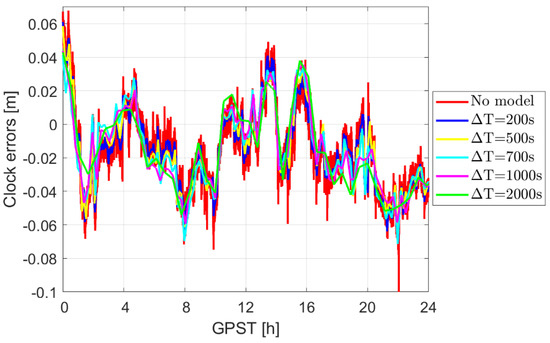 Using the same satellite geometry as in Section 3.2.1 and considering the same noise and mis-modeled effects, Figure 3 illustrates the smoothing effect in the kinematic clock estimates, applying the PWL model of different lengths. It can be observed that an increasing PWL length corresponds to a reduced -value in the 2.5-state model as shown in Figure 2. Unlike the 2.5-state model that constrains the clocks, also weakly in the long term, the PWL model puts infinitely strong constraints on clocks (above the linear polynomial) within each pre-defined . Applying the PWL model reduces the short-term stability of the estimated clock errors by adding an infinitely strong constraint for each PWL interval, i.e., estimated as linear polynomials.