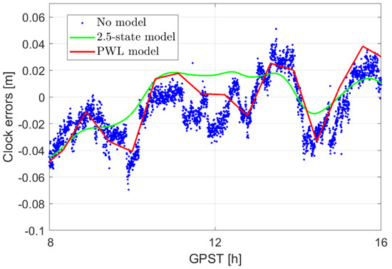 For clocks of good stabilities, e.g., the USOs, atomic clocks, or optical clocks that might be installed on future LEO satellites, modeling the clocks is helpful to de-correlate the clock parameters and kinematic radial orbits [7,15], thus improving the orbital accuracy. In this study, two clock models (i.e., the 2.5-state model and the PWL model) are used during the kinematic POD process, which will be described in the following two sections.