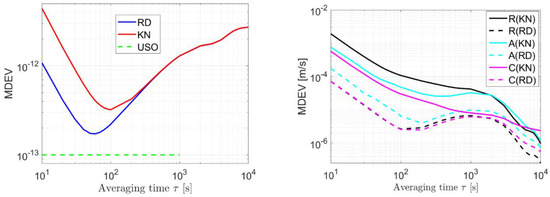 MDEVs of the clock estimates (left) and the orbital errors (right) in the kinematic (KN) and reduced-dynamic (RD) modes using the data from GRACE FO-1 and the CNES real-time GNSS products on 14 August 2018. Quadratic polynomial was detrended before calculating the MDEVs.