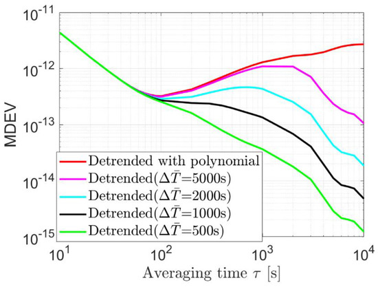 Different methods were used for clock detrending in previous studies, although not all for LEO satellite clocks. Examples are the detrending of the polynomial and harmonic terms [23], the Lomb-Scargle power spectrum and the continuous wavelet transform used for GNSS satellite clock analysis [24]. In this study, mean values within different lengths of smoothing windows are removed to detrend LEO satellite clocks. In such a way, the strength of the detrending effects can be controlled by varying the length of the smoothing windows.