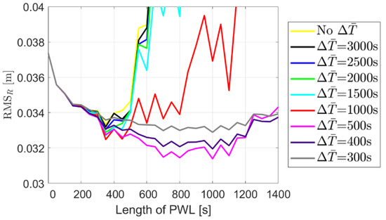 Applying the PWL clock model with different lengths from 300 to 3000 s (for each linear polynomial), the Root Mean Square (RMS) of the radial orbital errors is shown in Figure 7, detrended using different smoothing windows . From Figure 7 it can be observed that when detrending only with a quadratic polynomial (the yellow lines), applying the PWL model with a length longer than 400 s easily leads to large degradations in the orbital elements. When detrended with more systematic effects, as shown by the other colored lines, there is a potential to improve the orbital elements further. In general, a smoothing window of 500 s (see the magenta lines) provides a proper solution for the modelling without large degradation, even at a PWL length of 1400 s, and, at the same time, delivers significant improvement in the radial orbits, e.g., 16% at a PWL length of 1000 s. It is noted that the 3–4 cm RMS of the radial orbital was achieved in the ambiguity-float kinematic POD method using real-time GNSS products.