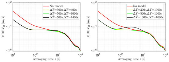 The MDEVs of the radial orbital errors are shown in the left panel of Figure 8 for a smoothing window of 500 s, as an example, and PWL lengths of 400 s, 1000 s and 1400 s. Despite the reduced short-term noise for all three PWL lengths, slight differences can be observed in the medium to long term around an averaging time of 1000 s. While the benefits in orbital improvement are not yet fully shown when applying a PWL of 400 s (the yellow line), a too-strong constraint with a PWL of 1400 s begins to degrade the orbits around 1000 s (the black line). In the right panel of Figure 8, the PWL model of 1000 s is applied when detrending the clocks with a smoothing window () of 300 s, 500 s and 1000 s. It can be observed that detrending the clocks using a smoothing window () of 1000 s does not allow for a PWL () of 1000 s and pushes the remaining mid-term clock systematic effects into the orbits. Further smoothing the clocks with a window of 500 s (or less) allows for such a PWL length. However, over-smoothing with, e.g., a window of 300 s also removes too many mis-modeled effects in the clocks, which offers less chance to improve the orbits through de-correlation (see the yellow line above the green line in the right panel of Figure 8).