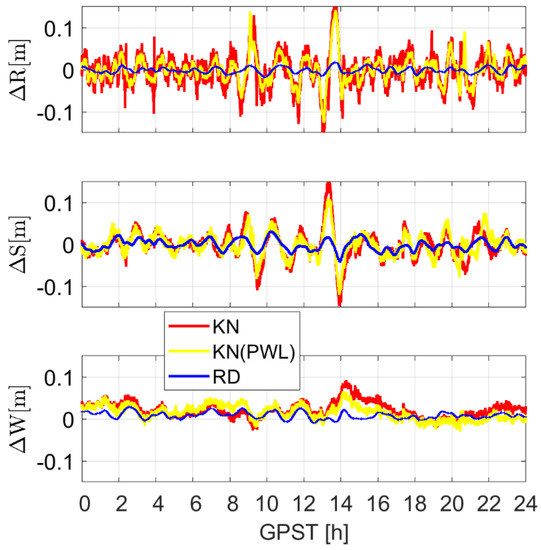 Radial (R), along-track (S) and cross-track (W) orbital errors in the reduced-dynamic (RD) mode and kinematic (KN) mode when not applying and applying the best PWL model for each direction.