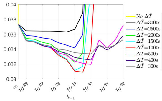 Taking the radial direction as an example, Figure 10 shows the RMS of the orbital errors applying the 2.5-state model for FFN with different values of, after being detrended with clocks of different smoothing windows. It can be observed that a rather significant improvement of about 19% can be obtained in the radial direction for a smoothing window of 1000 s at of (see the red line). Further decreasing the smoothing window would lead to smaller improvement and give a “safer” solution to avoid large degradations, even with a very small .