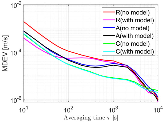 Correspondingly, the MDEVs of the orbital errors using the CNES real-time products are illustrated in the right panel of Figure 5 in the radial I, along-track (A) and cross-track (C) directions for both the kinematic (KN) and reduced-dynamic (RD) modes. For model consistency, the reduced-dynamic orbits computed using the CODE final products, applying the model described in Section 3.1, were taken as the reference orbits. The mis-modeled effects of the real-time GNSS products are visible in the right panel of Figure 5 as the arches from about 100 s to a few thousand seconds, which are caused by the real-time GPS orbital and clock errors, as well as possible model deficiencies in the reduced-dynamic mode. From the right panel of Figure 5, it can also be observed that the differences between the kinematic orbits (solid lines) and the reduced-dynamic orbits (dashed lines) are not only reflected in the increased short-term noise, but also in the enlarged projection of the mis-modeled effects on the orbits. In the kinematic mode, the radial orbital errors (solid black line) are higher than those in the other two directions due to the higher correlation between the radial orbits and the clocks in the estimation process.