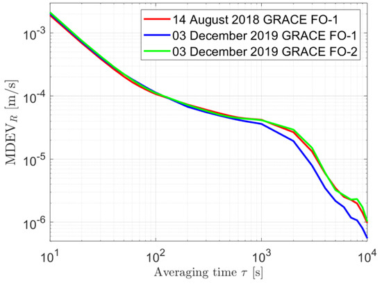 MDEV of the radial orbital errors of GRACE FO-1 and GRACE FO-2 on different test days without applying any clock models.