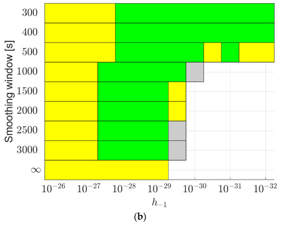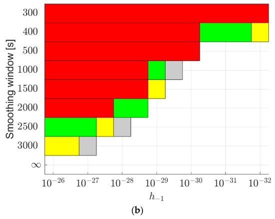 The conclusions above do not change when testing on another satellite, GRACE FO-2, on 3 December 2019 (see Figure 15). With the improvements increased to above 15% in this case, a smoothing window of 300 s to 500 s still appears to be a proper solution when applying the PWL model with a PWL length from 300 s to 1200 s, or using the 2.5-state model with from to .