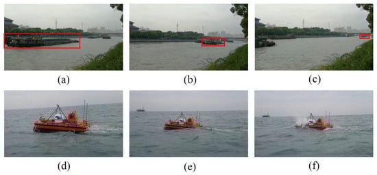 (a–c) When the ship is relative to the camera, there will be a large difference in scale. (The red box means the target to be tracked) (d–f) The part of the ship which is covered by sea due to weather and waves.