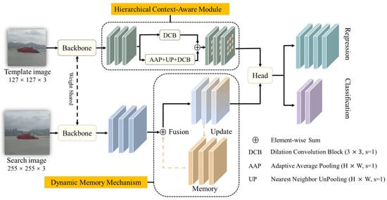 In this section, we provide a detailed description of our MGPN method for coastal ship tracking, as illustrated in Figure 2. Our approach relies on two key components: the Dynamic Memory Mechanism (DMM) in the search branch and the Hierarchical Context-Aware Module (HCAM) in the template branch. DMM dynamically updates the features of past frames and uses them as prior information to enhance current frame features. This allows us to exploit inter-frame correlation and incorporate more context and history into our tracking model, leading to improved accuracy and robustness. HCAM, on the other hand, enhances the receptive field of the template branch through a hierarchical global-and-local dilation convolution. The local convolution module maintains detailed information through a 3 × 3 small convolution kernel, while the global branch aggregates information through Global Pooling, which is implemented through Adaptive Average pooling. This enables our tracker to capture more detailed information about the ships, leading to stronger and more discriminative features that are robust to different ships. The hierarchical structure of HCAM also enhances the integrity and continuity of our features across different channels.