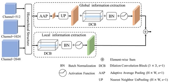In contrast to the local module, we design the global module concerning these models [,], which is structured as a combination of adaptive average pooling and dilation convolution block to acquire global information. Pooling can obtain the optimal elements in a region, and adaptive operation automatically sets the kernel size and stride in training. To balance the local information, we also set the number of modules to n. The relevant formula is defined as: