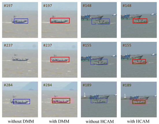 Visualization results with/without DMM and HCAM (#xxx means a certain frame in the video). Bounding boxes in blue come from our baseline, SiamBAN []. Bounding boxes in red come from the second column, and the fourth column shows the influence of DMM and HCAM. With the assistance of the components, our prediction fits the ship’s contour more closely and even obtains the ship that SiamBAN [] lost. Hence, our method is more precise and reliable.