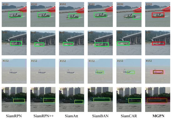 Visualization comparison: Figure 7 shows some tracking results of different methods on sample images. The first row is a fishing ship. The results from MGPN fit the ship’s profile better than SiamRPN, SiamRPN++, SiamAtt, and SiamBAN [], while SiamCAR shows a drift, which illustrates the advantage of our method in accuracy. The ships in the second and fourth rows are similar to the background. Other methods are not stable in tracking results and can only track a part of the ships, while MGPN benefits from the proposed DMM and HCAM, which overcomes this phenomenon with their enhanced features. In the third row, SiamRPN, SiamRPN++, and SiamAtt all lose the targets. MGPN obtains more accurate bounding boxes than SiamBAN [] with SiamCAR, which indicates that our method is more robust and can achieve outstanding performance.