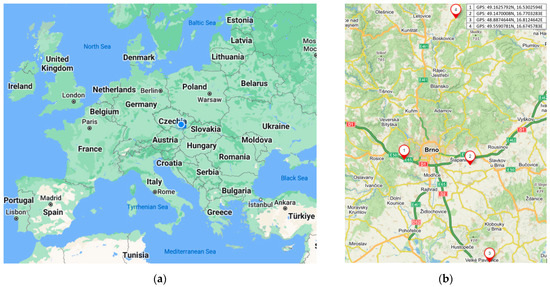 (a) Visualizing the overall area of the experiment; (b) positioning the corn fields that were subjected to the photogrammetric imaging in the relevant subsector of the South Moravian Region, Moravia, Czech Republic.