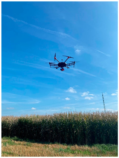 The sampling was invariably performed at identical time intervals, together with the multispectral imaging. To survey the quality of the corn hybrid, we opted for sampling according to the methodology recommended by the Central Institute for Supervising and Testing in Agriculture, Brno, Moravia, the Czech Republic [55]. The samples were acquired from three different sectors to expose the local field growth homogeneity; in each of the cases, we took a row of 10 whole corn plants and marked their positions on the multispectral maps acquired over the areas specified in Figure 2.