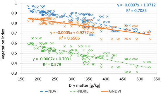 The details of the relationships between the analyzed vegetation indices and the dry matter values are plotted in Figure 4. Using a linear regression model, we found the following proportions: