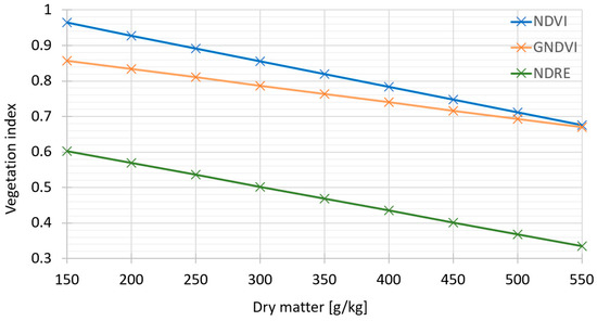 In view of the very strong correlation between the GNDVI and dry matter content values, the GNDVI can be described as having the best prediction results in the linear model.