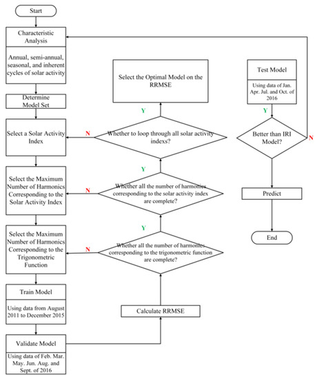 In brief, this paper uses the RRMSE analysis strategy as the model selection and evaluation criteria to establish the long-term prediction model of hmF2 according to the correlation between the Moscow station’s hmF2 median value data and solar activity and time. Finally, the validity and reliability of the prediction model are verified by the observation data and IRI model. According to the learning process of SML, the following is the process of data acquisition, model training, validation, and testing.