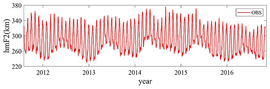 hmF2 data from the Moscow station (55.9°N, 37.7°E) are selected to train and learn the proposed model and parameters, which can be obtained from http://www.wdcb.ru (accessed on 1 January 2023) and were measured by an instrument known as the ionosonde. The collected data were averaged by month and hour to obtain the corresponding median value, which is the target variable modeled in this paper and referred to as hmF2 monthly median value data. Figure 2 shows the hmF2 monthly value data of the collected station, which was completed from August 2011 to October 2016 and used in this study to train and validate the proposed model.