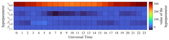 The exact value of the hyperparameter in the model can be obtained by substituting the training data into Equation (6) and using the least square method to fit it. The result is shown in Figure 4, where the rows represent the world from UT = 0 to UT = 23, the columns represent the names of the hyperparameters, and the colors represent the values of the hyperparameters.