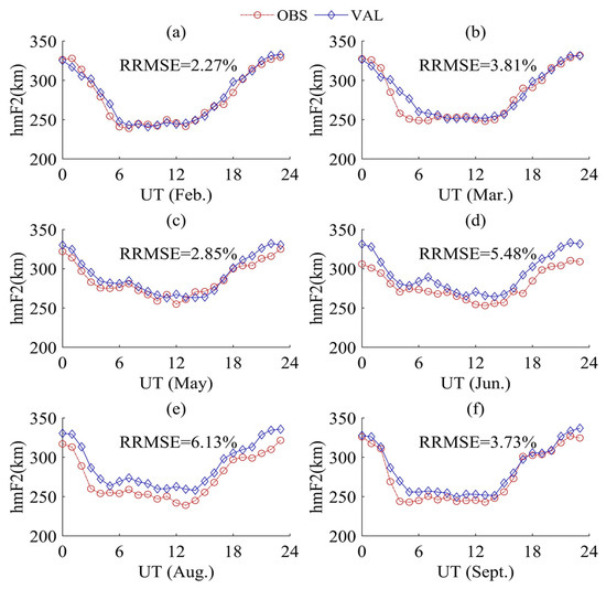 Based on the above conditions, it is only necessary to provide the sunspot number, month, and universal time corresponding to the time in the model to obtain the predicted value of hmF2. In Figure 5, we present the RRMSE between the observations and the predicted values obtained by using the verification dataset, where OBS is the observed value and VAL is the model validation value.