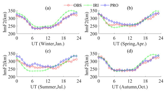 To test the generalization ability of the model, we compared the proposed model (denoted as PRO) with the IRI model [36]. The test data used are hmF2 of January (winter), April (spring), July (summer), and October (autumn) of 2016.