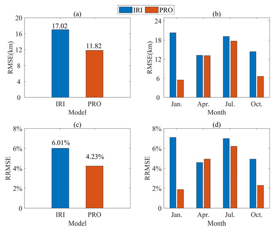 RMSE and RRMSE obtained by the IRI model and PRO model: (a) RMSE of the model; (b) RMSE calculated by month; (c) RRMSE of the model; (d) RRMSE calculated by month.