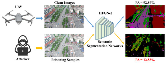 The aforementioned studies mainly focus on adversarial attacks against DNNs in the inference stage. However, recent research has explored the possibility of conducting attacks in the model training process, with the most typical form being data poisoning attacks [23]. Different from adversarial example attacks, data poisoning attacks influence the training of DNNs by contaminating training data [24], so that the model outputs incorrect prediction results. In Figure 1, we provide an example of performing data poisoning attacks on the aerial image semantic segmentation network. Here, we use HFGNet [25] as the target model for the attack. As shown in Figure 1, although the difference between the original aerial image and the crafted poisoning sample is invisible to the human visual system, the poisoning sample severely misleads the model prediction results. HFGNet achieved a PA of 92.86% trained on the original clean samples, while its PA decreases to only 12.58% on the poisoning samples. This phenomenon undoubtedly increases the security risk level of DNN-based aerial image semantic segmentation models.
